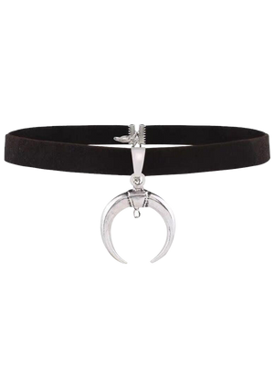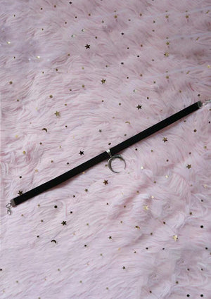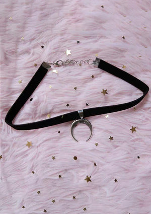 A moon choker is a type of choker necklace that features a moon-shaped pendant or charm. The moon charm can be made from various materials. Moon chokers are popular among those who enjoy alternative fashion and can be worn as a statement piece for everyday wear or for special occasions such as concerts or festivals. They can also be incorporated into cosplay outfits or gothic and witchy-inspired looks.