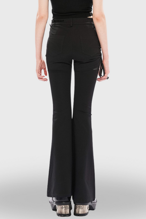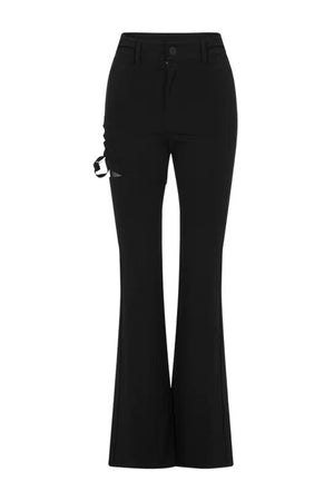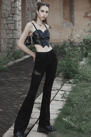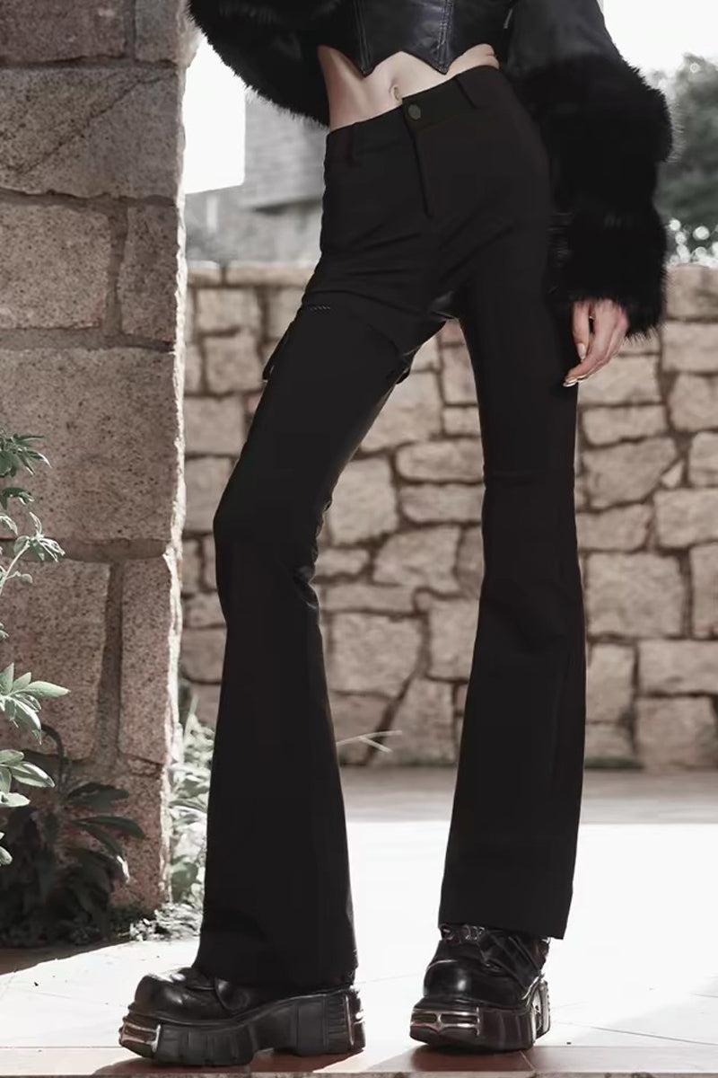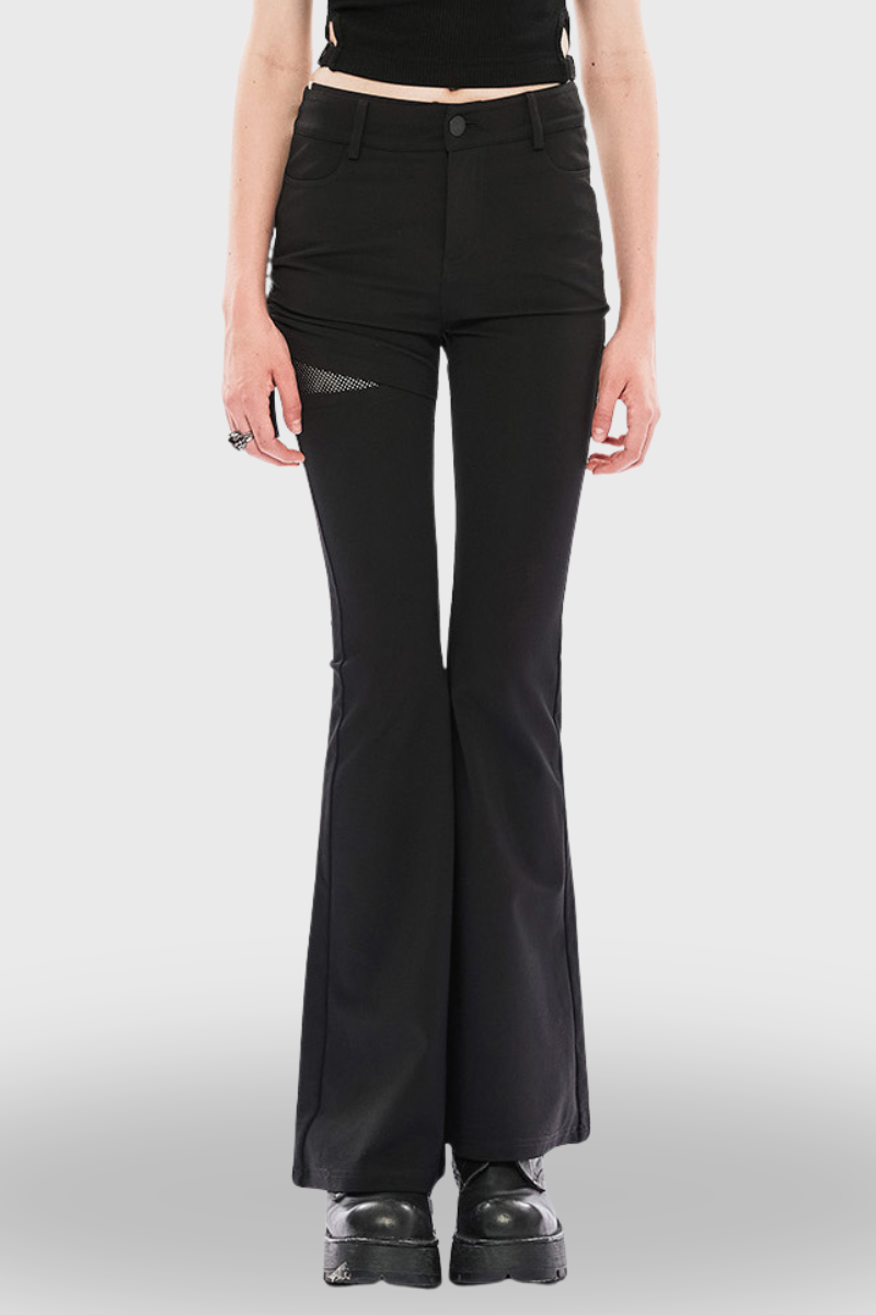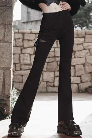 Turn up the attitude with these Edgy Street Style High-Waist Slight Flare Pants. The high-rise waist and subtle knee flare lengthen the legs, while the thigh area is open — featuring a paneled cutout that reveals mesh/inner-layer details for an exposed-layer effect. Pair with a cropped top and chunky boots for instant downtown-ready edge.