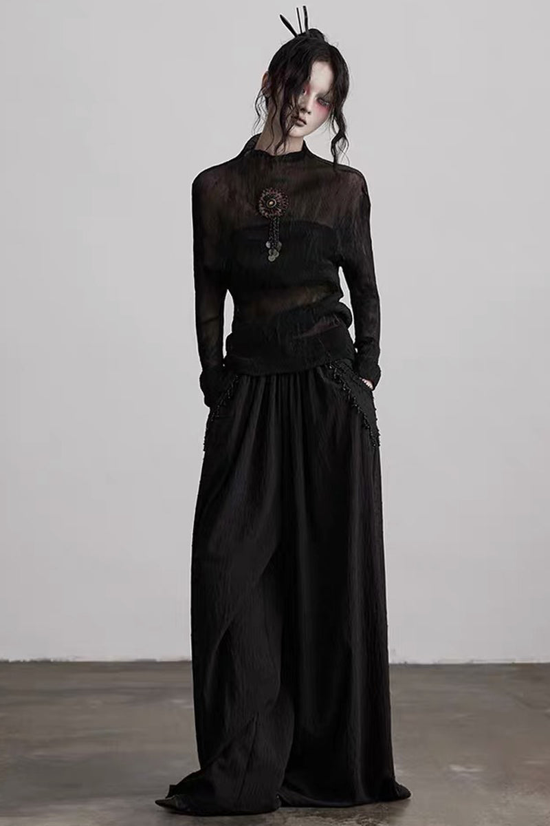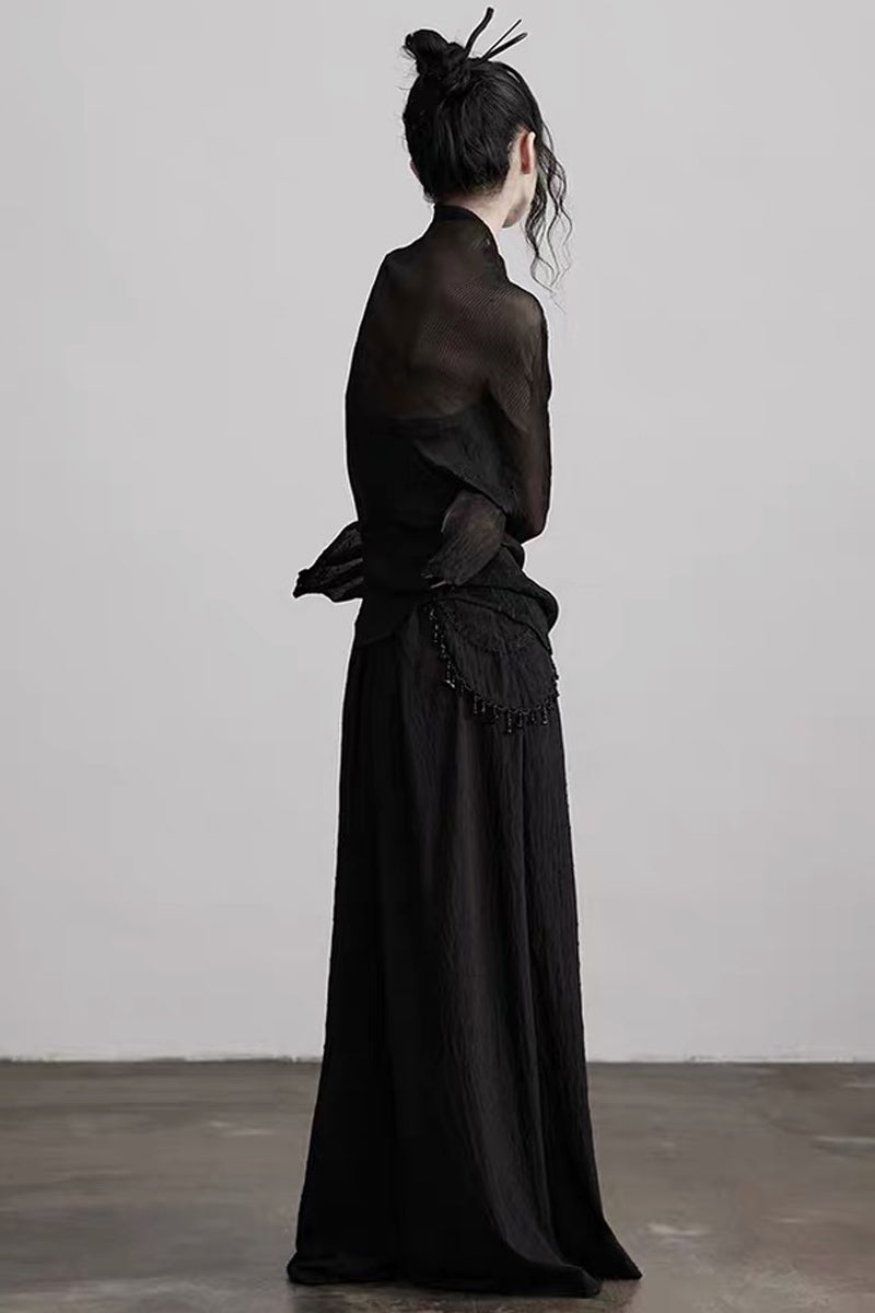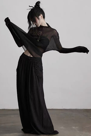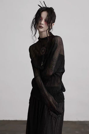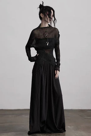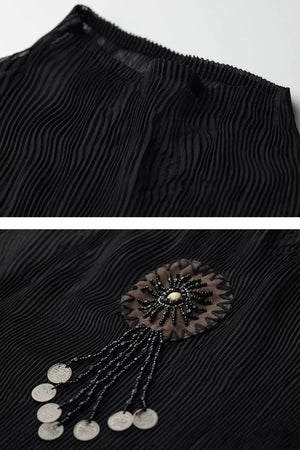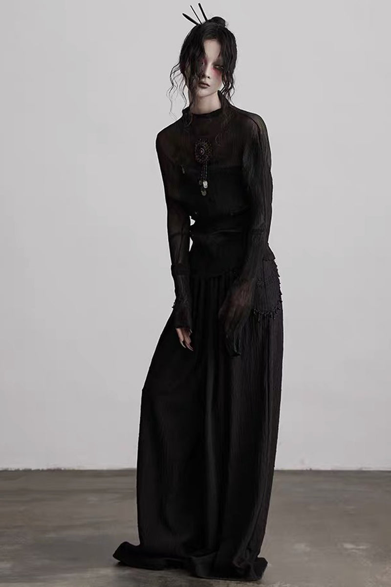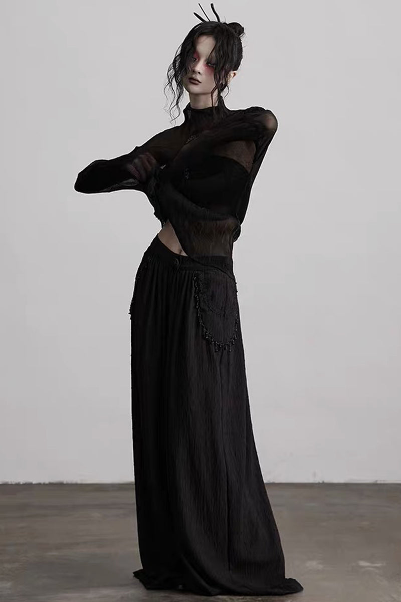 This edgy two-piece set combines Gothic allure with modern design. The top features delicate pleated mesh panels offering a subtle reveal, paired with a structured bandeau for contrast. Its dramatic silhouette, crafted from a lightweight fabric blend, ensures both comfort and a striking appearance. Perfect for making a bold fashion statement at evening events or themed parties. This versatile set embodies a perfect balance of dark romance and contemporary style.
