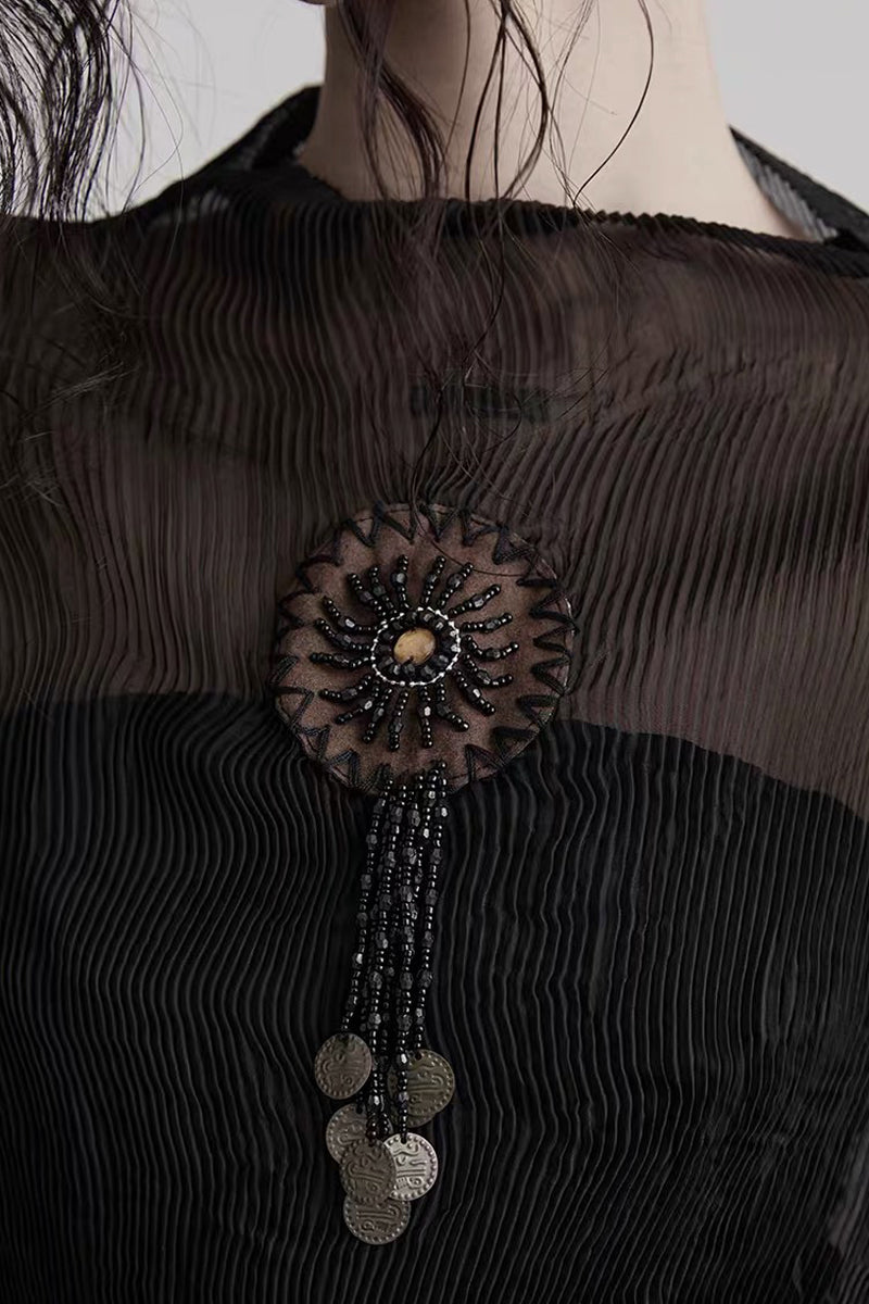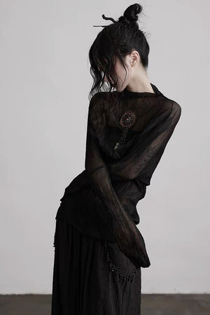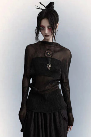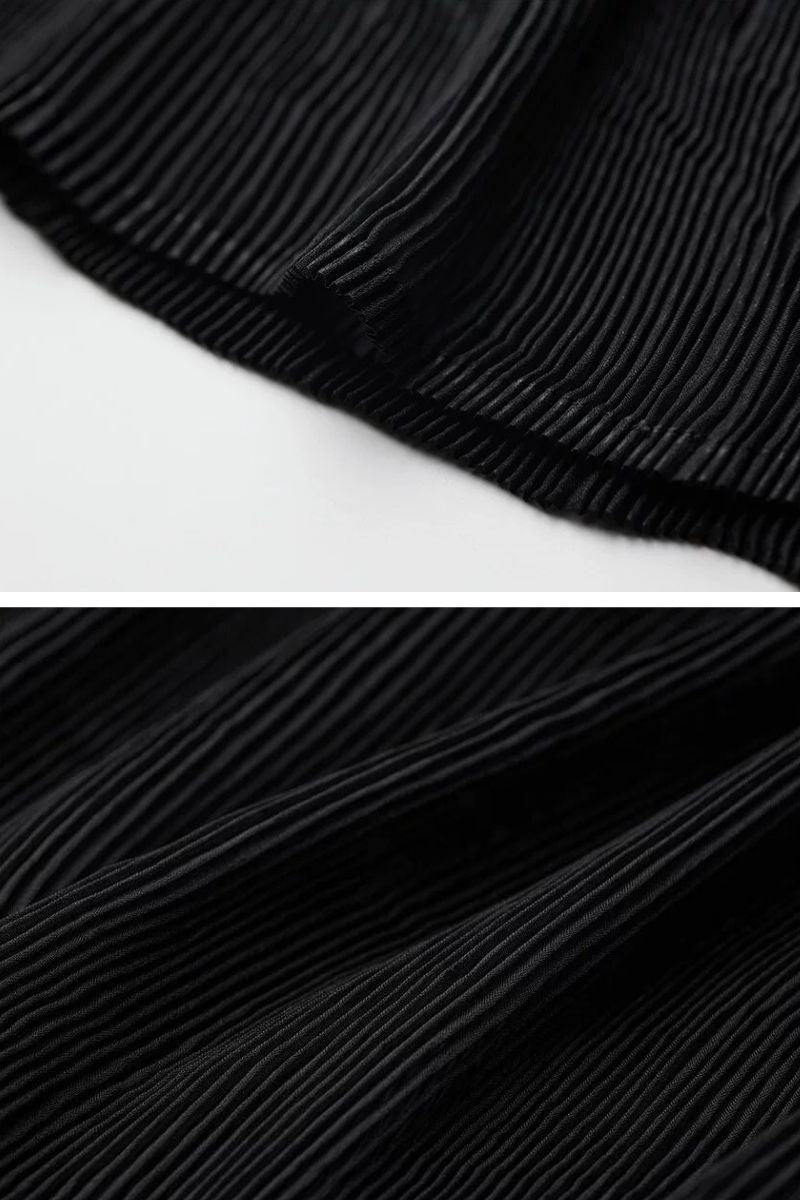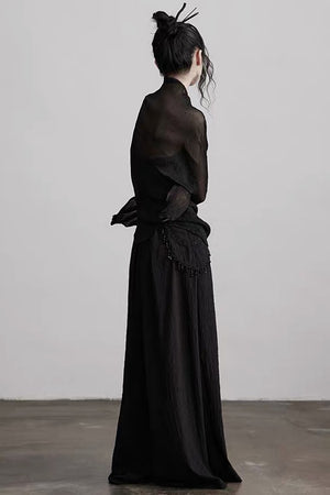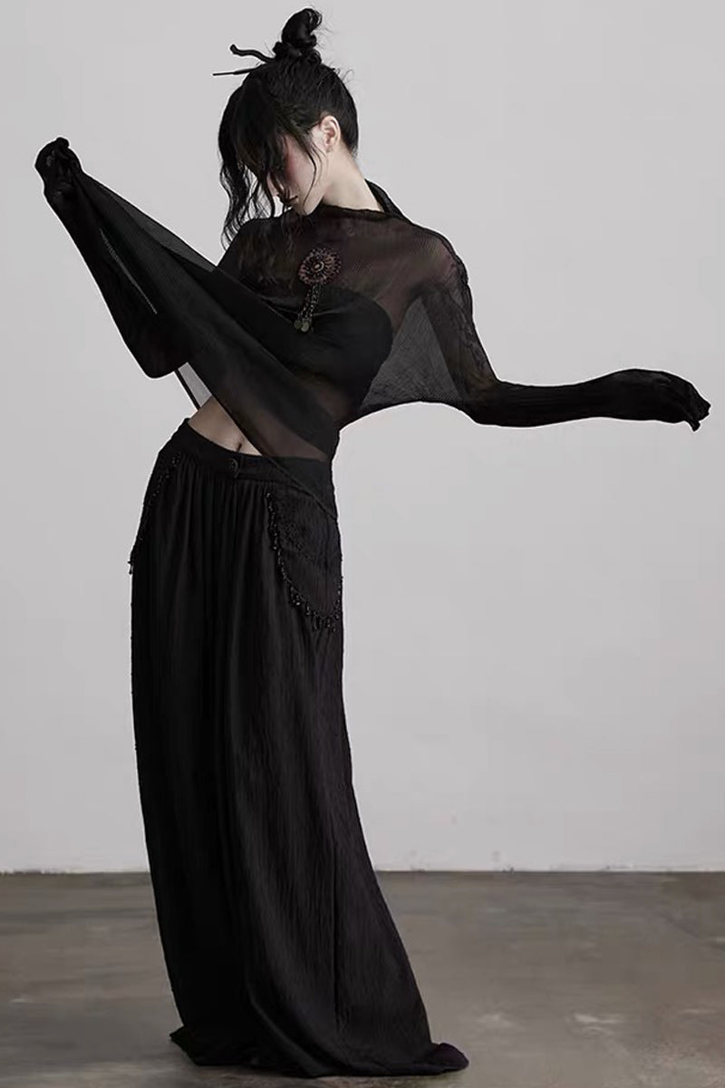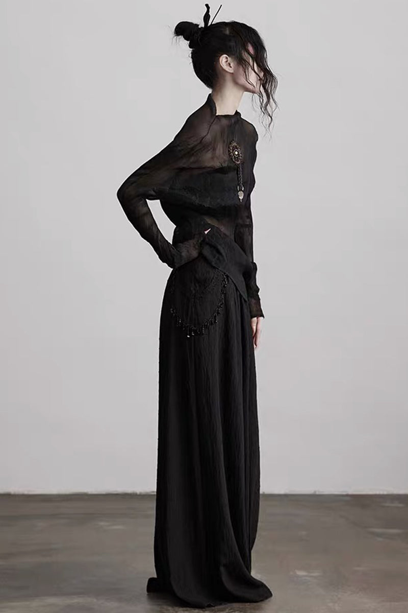 This edgy two-piece set combines Gothic allure with modern design. The top features delicate pleated mesh panels offering a subtle reveal, paired with a structured bandeau for contrast. Its dramatic silhouette, crafted from a lightweight fabric blend, ensures both comfort and a striking appearance. Perfect for making a bold fashion statement at evening events or themed parties. This versatile set embodies a perfect balance of dark romance and contemporary style.