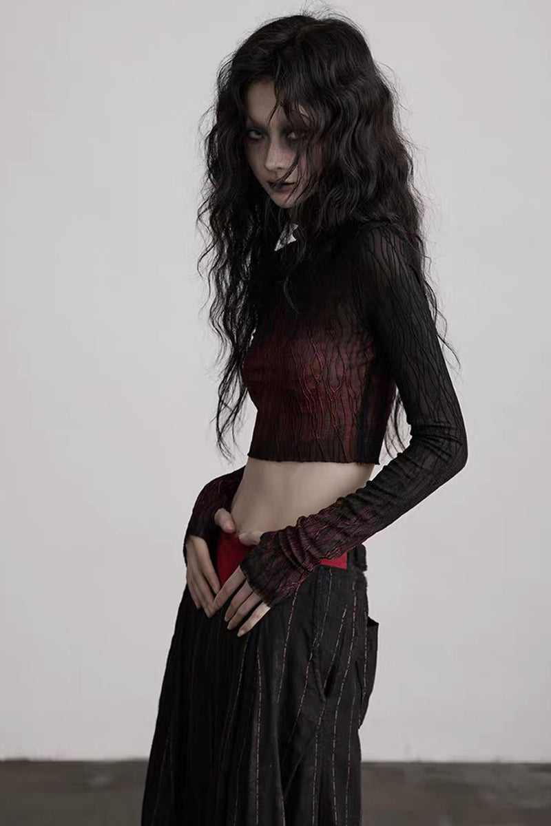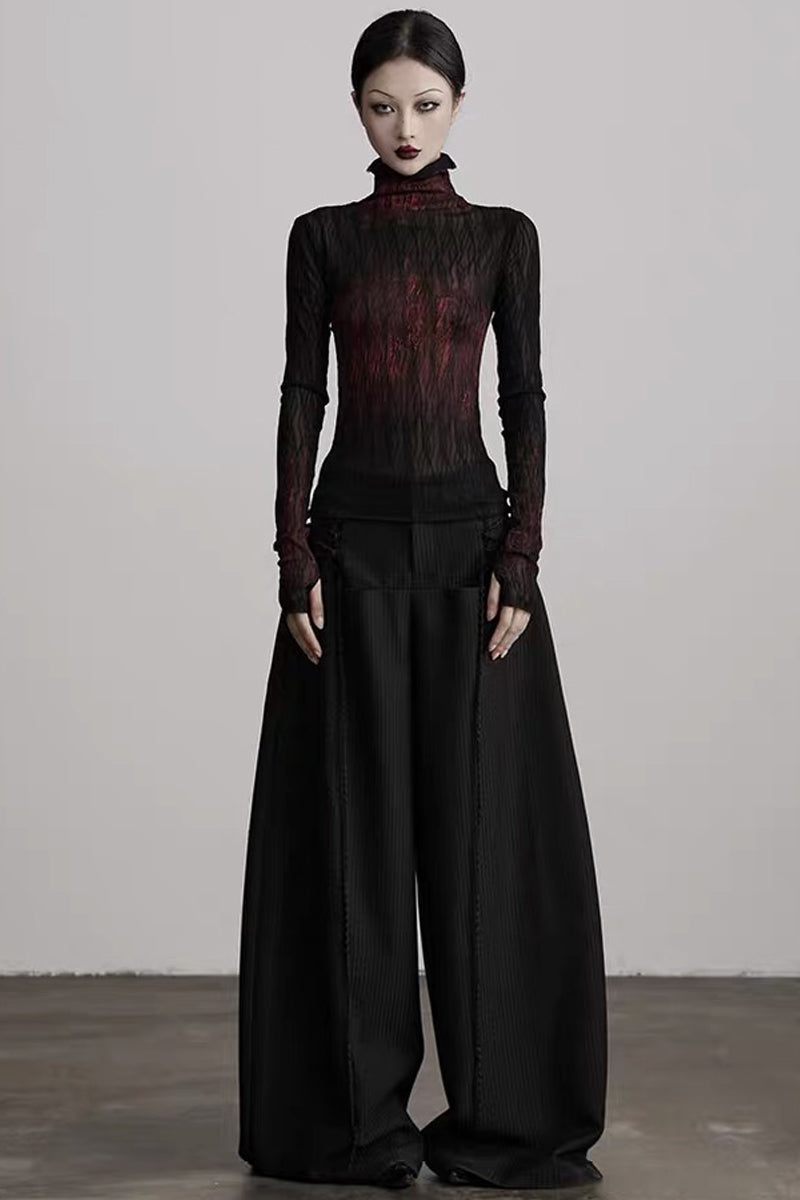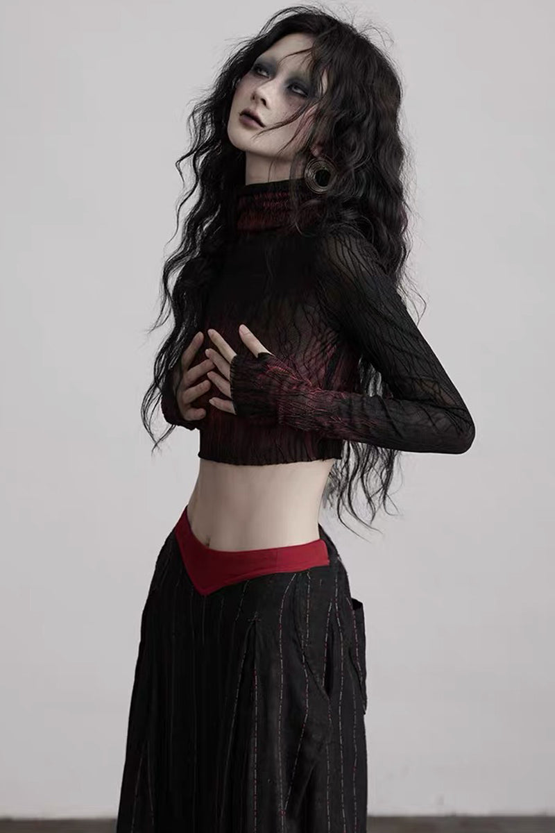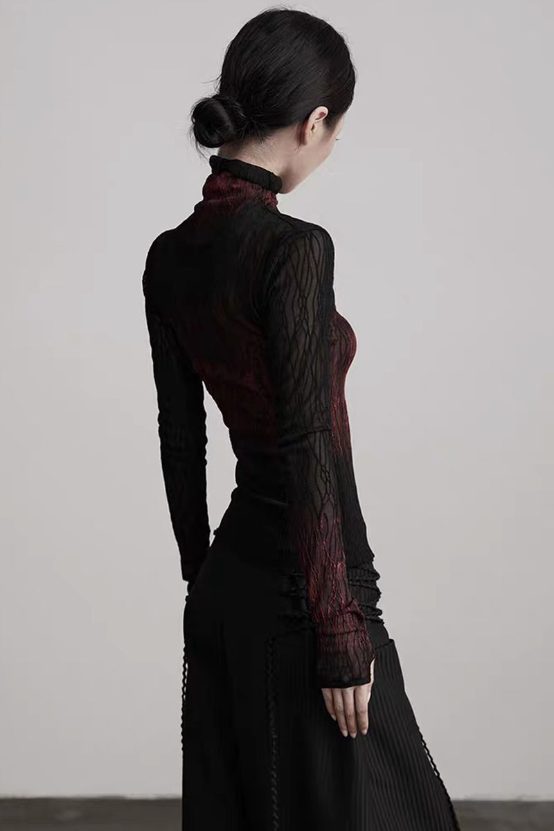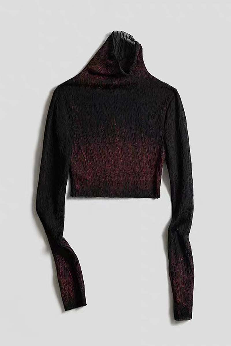 Elevate your everyday style with this exquisite long-sleeve top. The delicate lace knit fabric creates a soft, textured look, while the beautiful ombre color fade adds a modern and artistic touch. Featuring a comfortable mock neck for a chic, layered effect, this top is perfect for adding a feminine edge to your outfit. Versatile and effortlessly stylish, it pairs beautifully with jeans, skirts, or wide-leg pants for a touch of understated elegance.