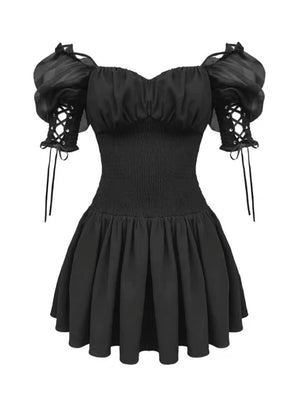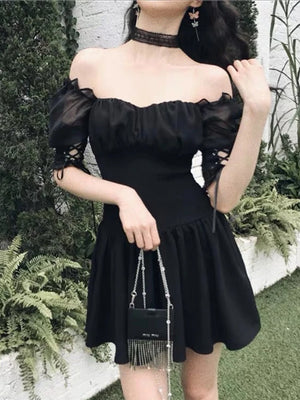 Off Shoulder Black Waisted Mini Dress