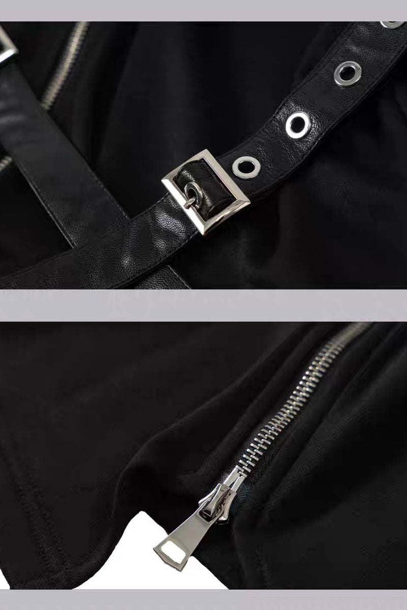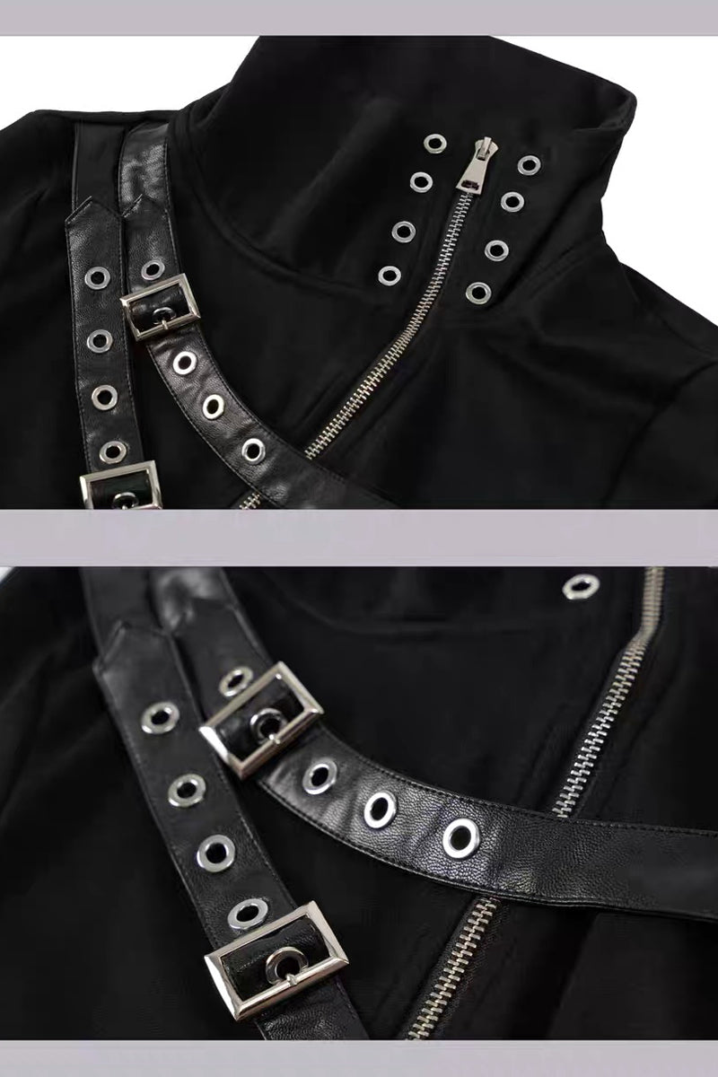 This Punk Buckle Harness Long Sleeve Top combines edgy attitude with everyday wearability: a fitted mock‑neck base layered with crossed faux‑leather buckle straps, metal eyelets and an asymmetric zipper for instant punk/goth appeal. Made from a soft, slightly stretchy blend, it hugs the body for a sleek silhouette while allowing comfortable movement—perfect as a statement outer layer or a textured base for jackets and harnesses. Pair it with high‑waisted cargo pants, a leather jacket and combat boots for a bold streetwear look.