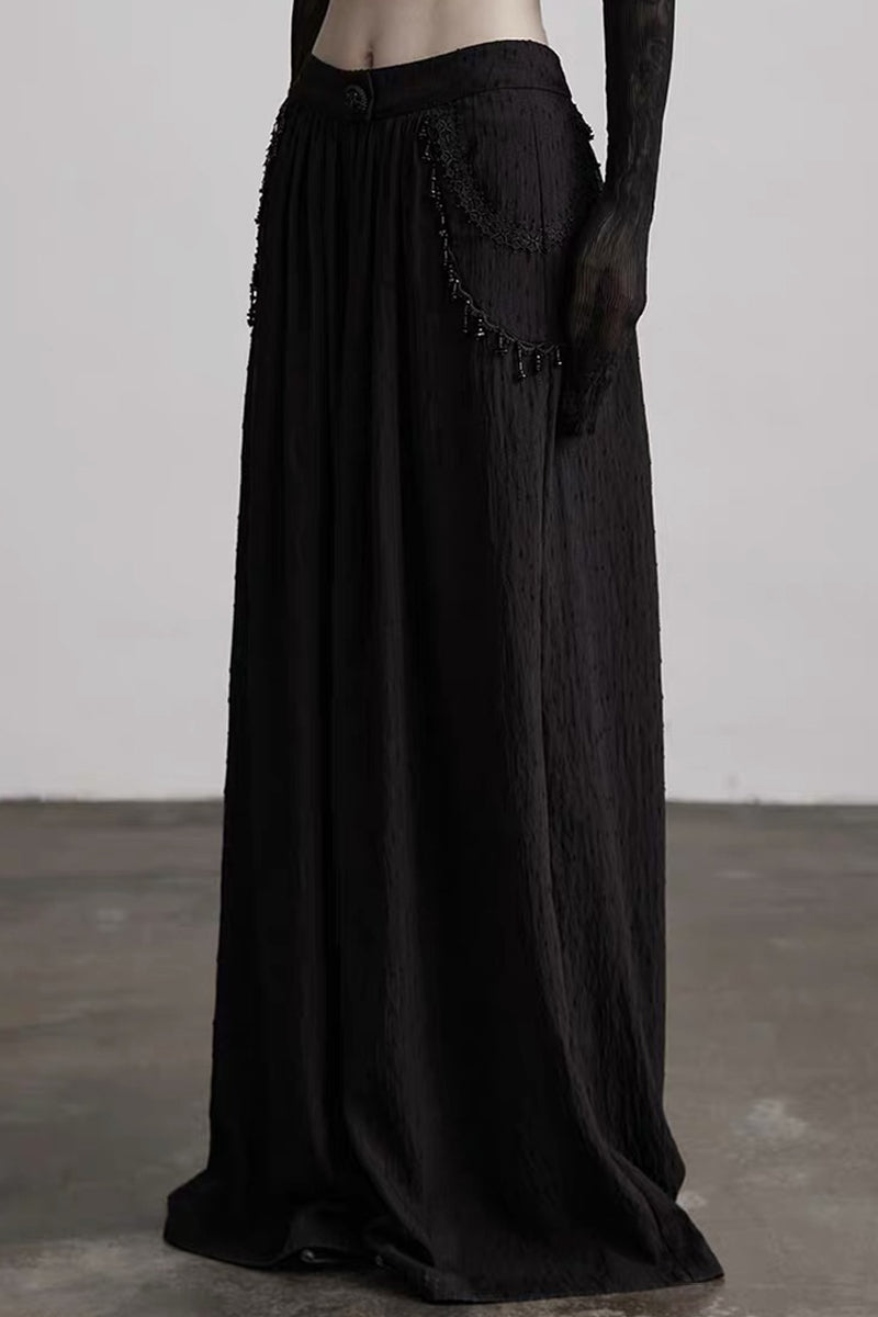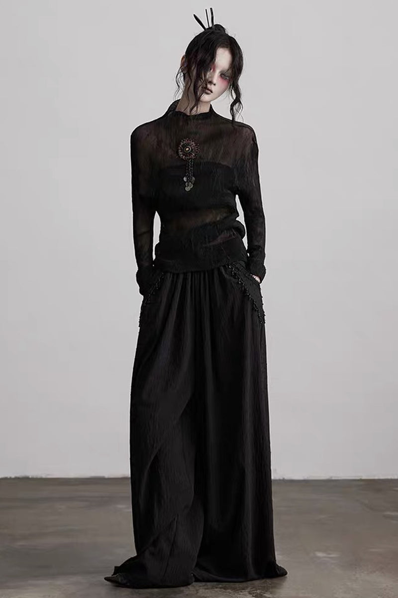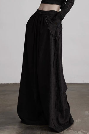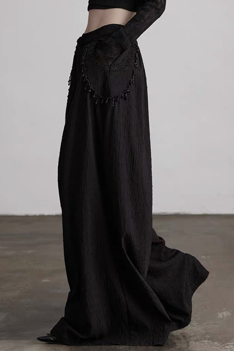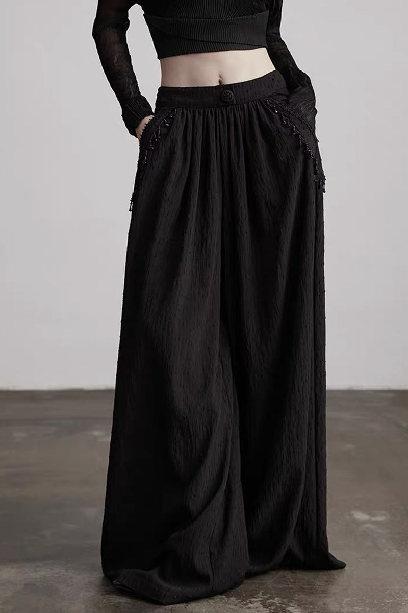 Embrace a unique blend of artisanal craft and modern silhouette with these wide-leg trousers. The minimalist design is elevated by a striking draped stone accent that adds a touch of sculptural elegance. Crafted from a fabric with a distinct organic texture, they offer visual depth and tactile interest. The fluid, high-waisted cut and sweeping legs ensure effortless comfort and dramatic movement. Perfect for creating a statement look, these trousers merge minimalist aesthetics with thoughtful, artistic details for a truly distinctive style.