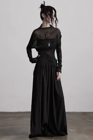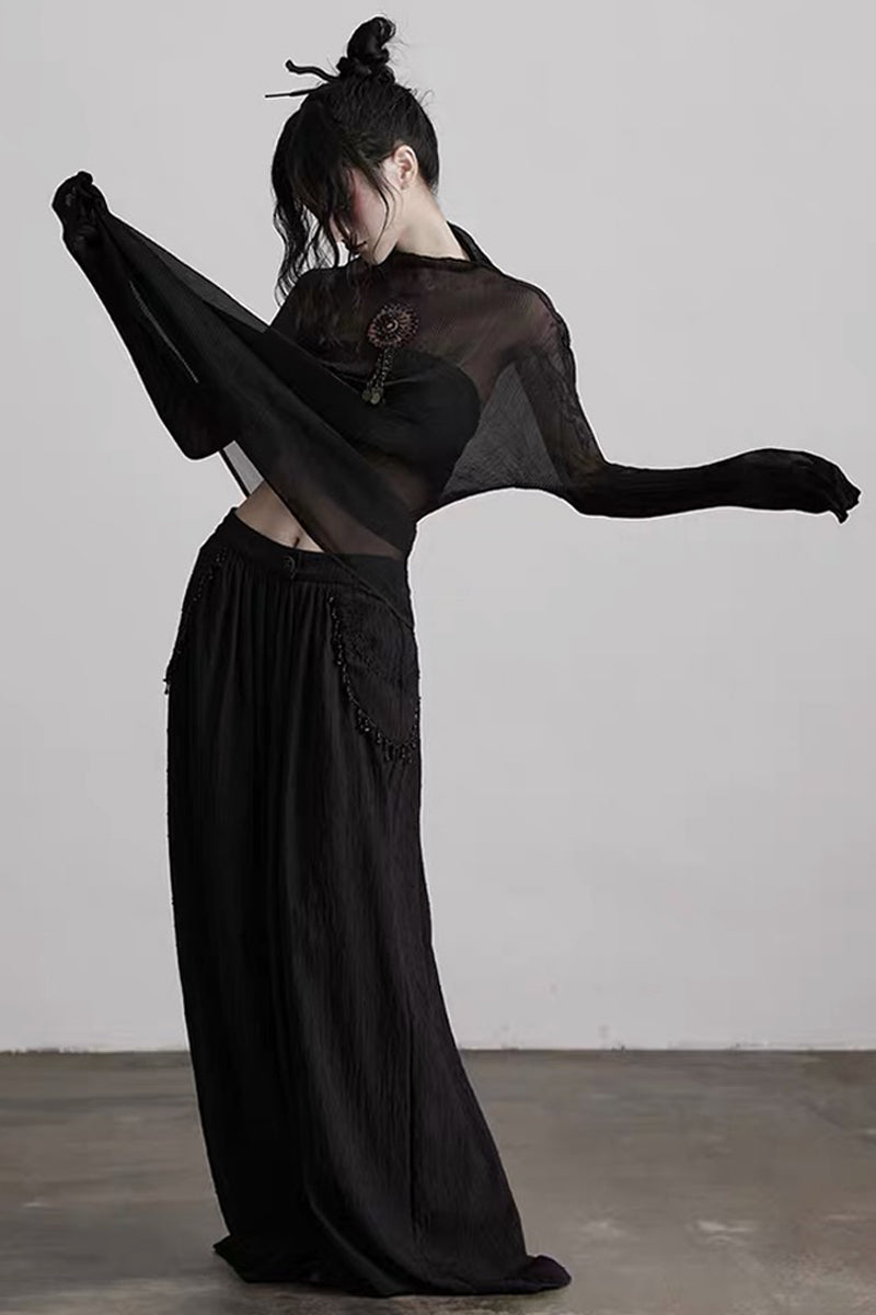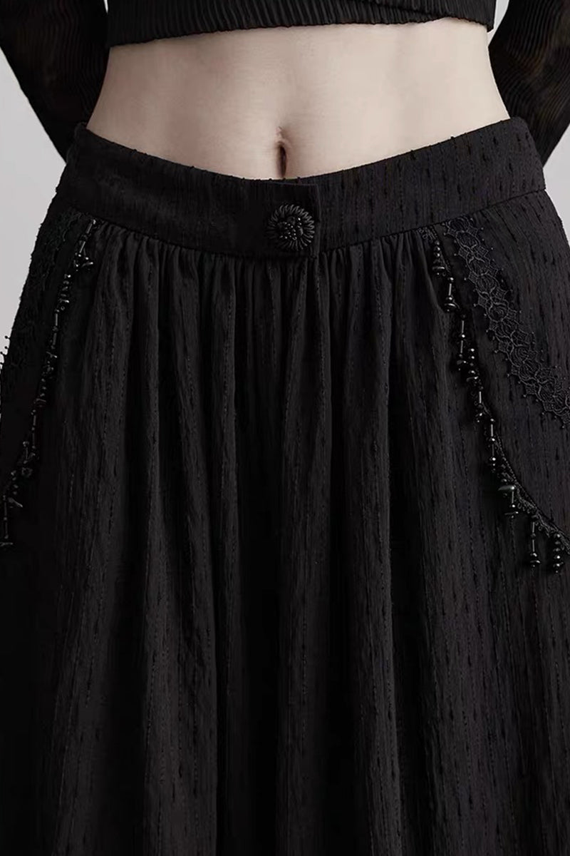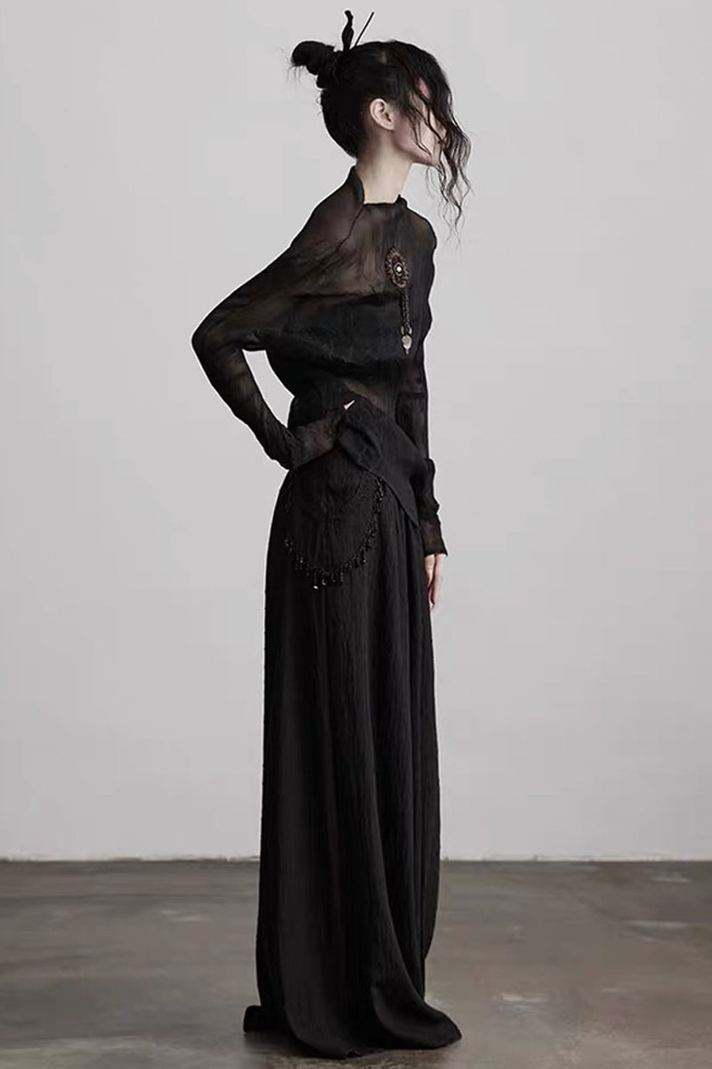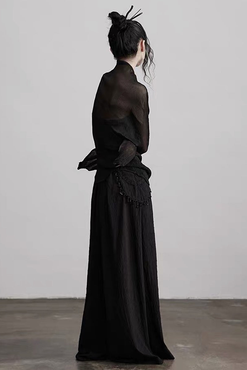 Embrace a unique blend of artisanal craft and modern silhouette with these wide-leg trousers. The minimalist design is elevated by a striking draped stone accent that adds a touch of sculptural elegance. Crafted from a fabric with a distinct organic texture, they offer visual depth and tactile interest. The fluid, high-waisted cut and sweeping legs ensure effortless comfort and dramatic movement. Perfect for creating a statement look, these trousers merge minimalist aesthetics with thoughtful, artistic details for a truly distinctive style.