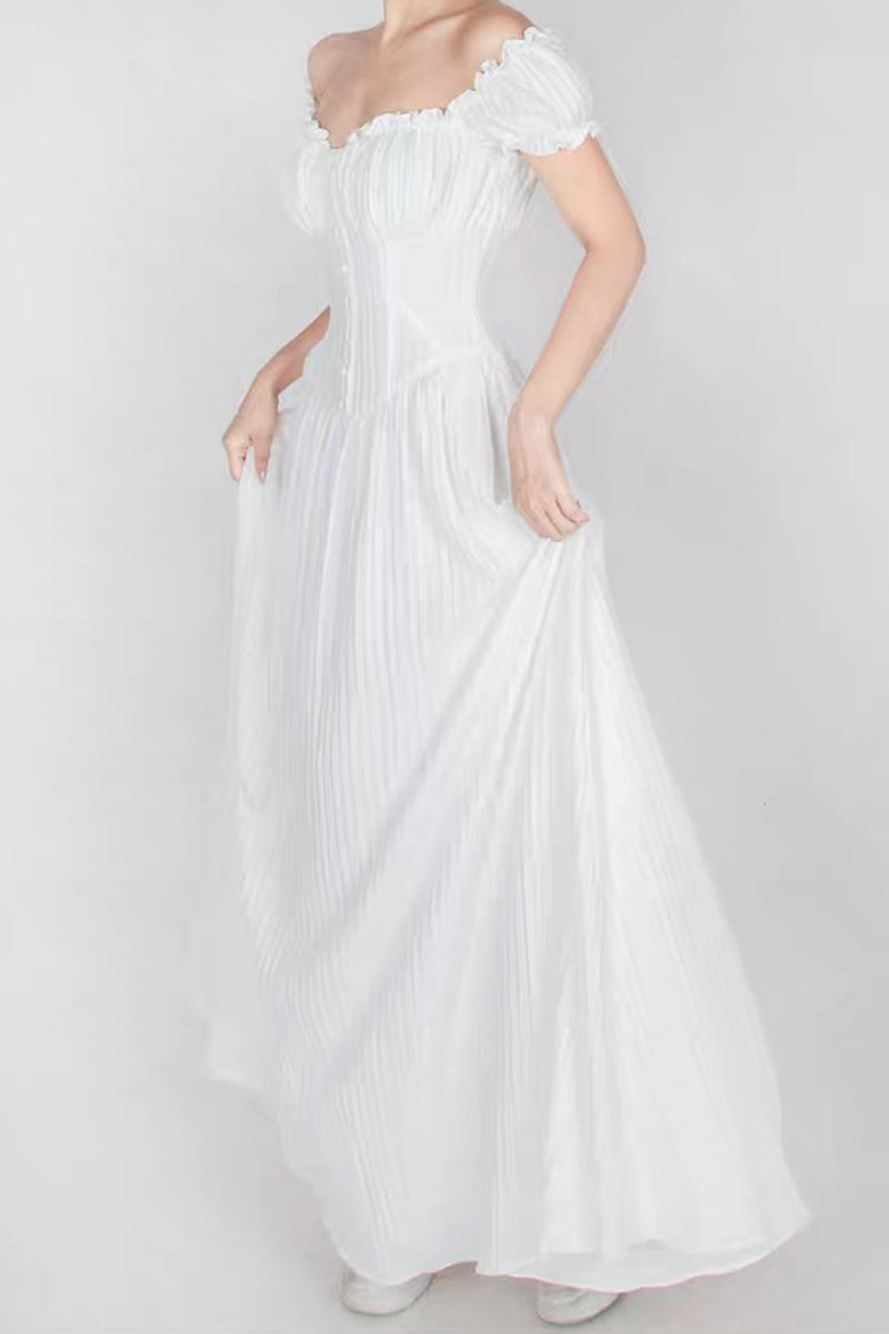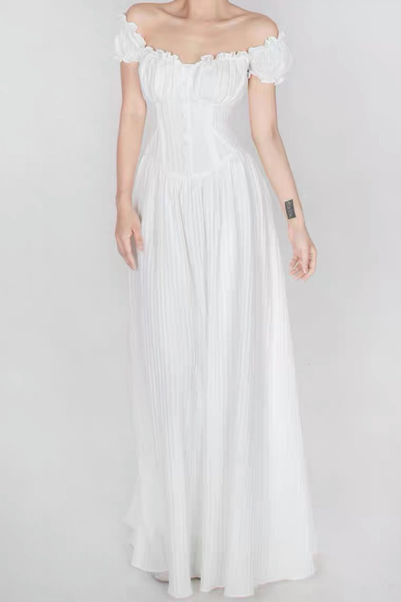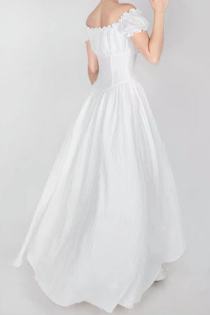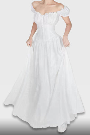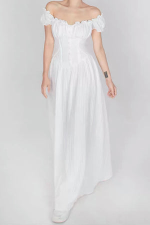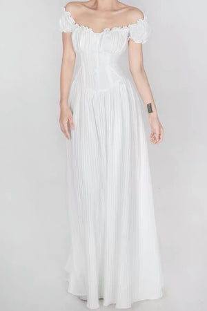 This exquisite vintage dress exudes timeless romance. The flattering off-the-shoulder neckline elegantly frames the collarbone, offering a touch of allure. Crafted from a delicate fabric, it flows into a graceful a-line silhouette that skims the body. Delicate details enhance its charming, retro appeal. Perfect for travel, garden parties or a romantic dinner, this dress is a statement piece that combines vintage elegance with effortless style, making you feel both feminine and sophisticated.